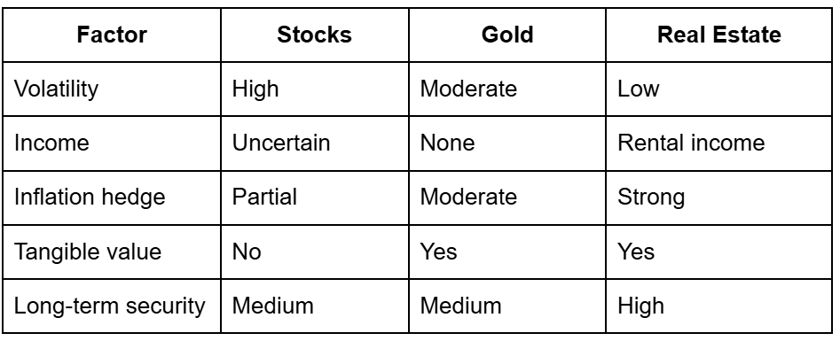 While stocks and gold have their place in a balanced portfolio, real estate remains the safest investment for long-term wealth creation. Its stability, income potential, inflation protection, and emotional security make it unmatched especially during uncertain economic times.